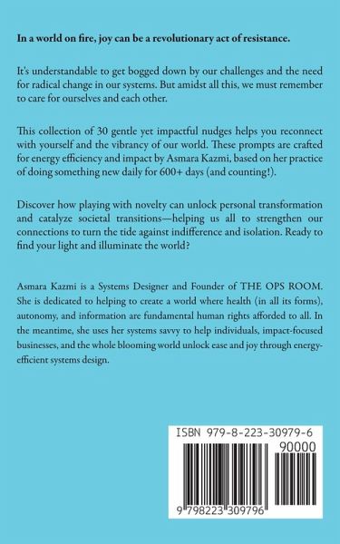 In a world on fire, joy can be a revolutionary act of resistance. It's understandable to get bogged down by our challenges and the need for radical change in our systems. But amidst all this, we must remember to care for ourselves and each other. This collection of 30 gentle yet impactful nudges helps you reconnect with yourself and the vibrancy of our world. These prompts are crafted for energy efficiency and impact by Asmara Kazmi, based on her practice of doing something new daily for 600+ days (and counting!). Discover how playing with novelty can unlock personal transformation and catalyze societal transitions—helping us all to strengthen our connections to turn the tide against indifference and isolation. Ready to find your light and illuminate the world?