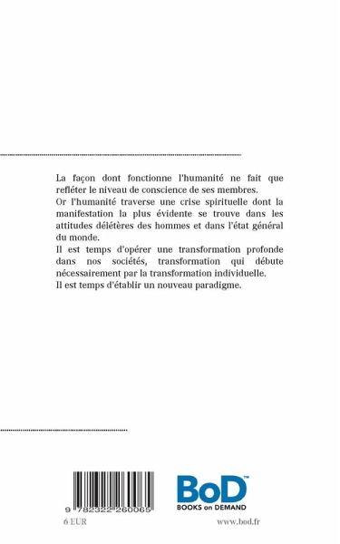 La façon dont fonctionne l'humanité ne fait que refléter le niveau de conscience de ses membres.Or l'humanité traverse une crise spirituelle dont la manifestation la plus évidente se trouve dans les attitudes délétères des hommes et dans l'état général du monde.Il est temps d'opérer une transformation profonde dans nos sociétés, transformation qui débute nécessairement par la transformation individuelle.Il est temps d'établir un nouveau paradigme.