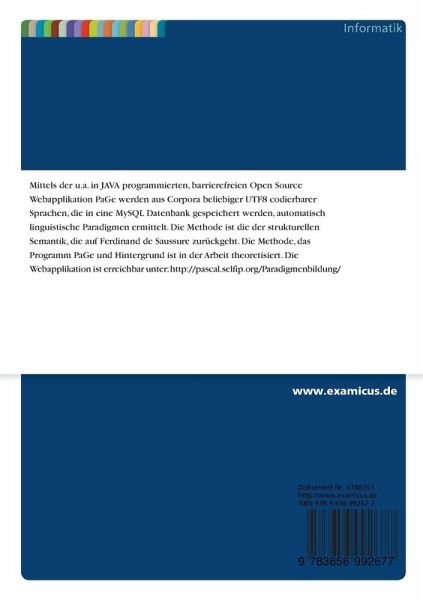 Magisterarbeit aus dem Jahr 2006 im Fachbereich Informatik - Didaktik, Note: 1, Universität zu Köln, Sprache: Deutsch, Abstract: Mittels der u.a. in JAVA programmierten, barrierefreien Open Source Webapplikation PaGe werden aus Corpora beliebiger UTF8 codierbarer Sprachen, die in eine MySQL Datenbank gespeichert werden, automatisch linguistische Paradigmen ermittelt. Die Methode ist die der strukturellen Semantik, die auf Ferdinand de Saussure zurückgeht. Die Methode, das Programm PaGe und Hintergrund ist in der Arbeit theoretisiert. Die Webapplikation ist erreichbar unter:http://pascal.selfip.org/Paradigmenbildung