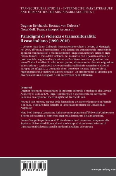 Il volume, nato da un Colloquio internazionale svoltosi a Loveno di Menaggio nel 2014, affronta "il caso italiano" della letteratura transculturale intrecciando approcci comparatistici e multidisciplinari (linguistici, letterari, artistico-figurativi e filmici). Il tema della violenza, nei suoi nessi con il passato coloniale e postcoloniale, le guerre di espansione nel Mediterraneo e la migrazione da e verso l'Italia, è studiato in relazione al potere, alla memoria culturale, migrazione ed esclusione - tutti aspetti socio-culturali attualissimi se pensiamo alla crisi europea dei rifugiati. La domanda che si pone è se, nel caso italiano, si stia raggiungendo una "malinconia postcoloniale", un inasprimento di violenze per diversità culturali e religiose o una convivenza nella differenza.