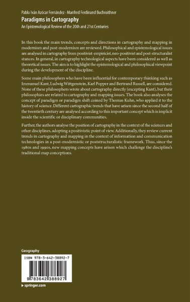 Some main philosophers who have been influential for contemporary thinking such as Immanuel Kant, Ludwig Wittgenstein, Karl Popper and Bertrand Russell, are considered. None of these philosophers wrote about cartography directly (excepting Kant), but their philosophies are related to cartography and mapping issues. The book also analyses the concept of paradigm or paradigm shift coined by Thomas Kuhn, who applied it to the history of science. Different cartographic trends that have arisen since the second half of the twentieth century are analysed according to this important concept which is implicit inside the scientific or disciplinary communities.