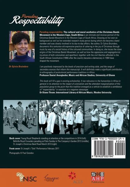 Parading respectability: The cultural and moral aesthetics of the Christmas Bands Movement in the Western Cape, South Africa is an intimate and incisive portrait of the Christmas Bands Movement in the Western Cape of South Africa. Drawing on her own on background as well as her extended research study period during which she became a band member and was closely involved in its day-to-day affairs, the author, Dr Sylvia Bruinders, documents this centuries-old expressive practice of ushering in the joy of Christmas through music by way of a social history of the coloured communities. In doing so, she traces the slave origins of the Christmas Bands Movement, as well as how the oppressive and segregationist injustices of both colonialism and apartheid, together with the civil liberties afforded in the South African Constitution (1996) after the country became a democracy in 1994 have shaped the movement.