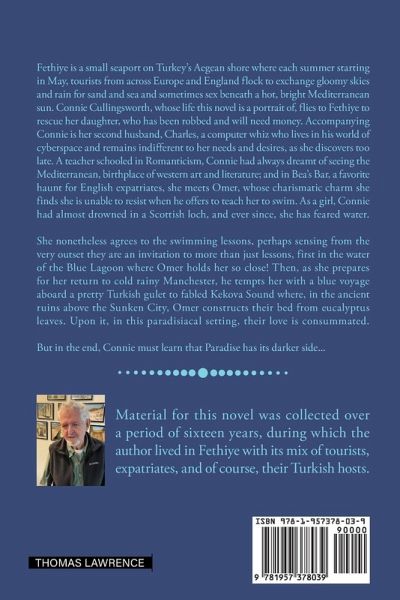 Fethiye is a small seaport on Turkey's Aegean shore where each summer starting in May, tourists from across Europe and England flock to exchange gloomy skies and rain for sand and sea and sometimes sex beneath a hot, bright Mediterranean sun. Connie Cullingsworth, whose life this novel is a portrait of, flies to Fethiye to rescue her daughter, who has been robbed and will need money. Accompanying Connie is her second husband, Charles, a computer whiz who lives in his world of cyberspace and remains indifferent to her needs and desires, as she discovers too late. A teacher schooled in Romanticism, Connie had always dreamt of seeing the Mediterranean, birthplace of western art and literature; and in Bea's Bar, a favorite haunt for English expatriates, she meets Omer, whose charismatic charm she finds she is unable to resist when he offers to teach her to swim. As a girl, Connie had almost drowned in a Scottish loch, and ever since, she has feared water. She nonetheless agrees to the swimming lessons, perhaps sensing from the very outset they are an invitation to more than just lessons, first in the water of the Blue Lagoon where Omer holds her so close! Then, as she prepares for her return to cold rainy Manchester, he tempts her with a blue voyage aboard a pretty Turkish gulet to fabled Kekova Sound where, in the ancient ruins above the Sunken City, Omer constructs their bed from eucalyptus leaves. Upon it, in this paradisiacal setting, their love is consummated. But in the end, Connie must learn that Paradise has its darker side...