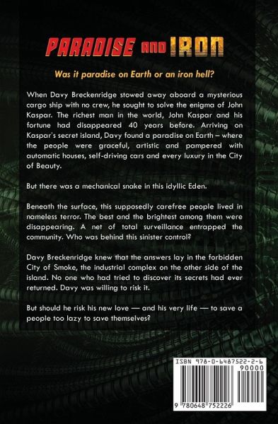 Was it Paradise on Earth or an Iron Hell? When Davy Breckenridge stowed away aboard a mysterious cargo ship, he sought to solve the enigma of John Kaspar. The richest man in the world, John Kaspar and his fortune had disappeared 40 years before. Arriving on Kaspar's secret island, Davy found a paradise on Earth. The people of the City of Beauty were graceful and artistic; pampered with automatic houses, self-driving cars and every conceivable luxury. But there was a mechanical snake in this idyllic Eden. Beneath the surface, this supposedly carefree people lived in nameless terror. The best and the brightest among them were disappearing. A net of total surveillance entrapped the community. Who was behind this sinister control? Davy Breckenridge knew that the answers lay in the forbidden City of Smoke, the industrial complex on the other side of the island. No one who had tried to discover its secrets had ever returned. Davy was willing to risk it. But should he risk his new love - and his very life - to save a people too lazy to save themselves?