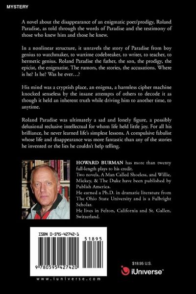 A novel about the disappearance of an enigmatic poet/prodigy, Roland Paradise, as told through the words of Paradise and the testimony of those who knew him and those he knew. In a nonlinear structure, it unravels the story of Paradise from boy genius to watchmaker, to wartime codebreaker, to writer, to teacher, to hermetic genius. Roland Paradise the father, the son, the prodigy, the epicist, the enigmatist. The rumors, the stories, the accusations. Where is he? Is he? Was he ever.? His mind was a cryptish place, an enigma, a harmless cipher machine knocked senseless by the insane attempts of others to decode it as though it held an inherent truth while driving him to another time, to anytime. Roland Paradise was ultimately a sad and lonely figure, a possibly delusional reclusive intellectual for whom life held little joy. For all his brilliance, he never learned life's simplest lessons. A compulsive fabulist whose life and disappearance was more fantastic than any of the stories he invented or the lies he couldn't help telling.