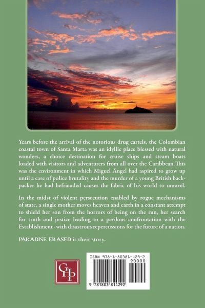 PARADISE ERASED Chronicle of an Exile Before the arrival of the notorious drug cartels, the Colombian coastal town of Santa Marta was an idyllic place blessed with natural wonders, a choice destination for cruise ships and steam boats loaded with visitors and adventurers from all over the Caribbean. This was the environment in which Miguel angel had aspired to grow up until a case of police brutality and the murder of a young British backpacker he had befriended causes the fabric of his world to unravel. In the midst of violent persecution enabled by rogue mechanisms of state, a single mother moves heaven and earth in a constant attempt to shield her son from the horrors of being on the run, her search for truth and justice leading to a perilous confrontation with the Establishment - with disastrous repercussions for the future of a nation. PARADISE ERASED is their story.