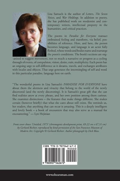 The poems in "Paradise for Everyone" transact embrained feeling and transform, via belief, possibilities of reference. Here, and here, the person becomes language, and language is an actor fully fleshed, whose words and bodies name and rearrange the poem's conditions. The book's sections are organized to suggest movement, not so much a narrative or progress as a cycling through of events, of compulsion, vision, desire, ruin, multiplicity. Each poem has an ongoing urge to self-difference as it dreams, travels, and exchanges attributes with locales and objects. That urge generates the intermingling of self and word in this particular paradise, language here on earth. Lisa Samuels teaches literature, poetic theory, and creative writing at the University of Wisconsin-Milwaukee. In addition to poetry, she has published essays and edited work on modernist and contemporary writers, on intellectual property issues in the humanities, and on practices of literary criticism.