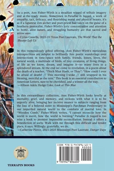 In this extraordinary collection, Ann Fisher-Wirth looks levelly at mortality, grief, and memory, and reckons with what it is to be urgently alive, bringing her incisive nuance to subjects ranging from the loss of a beloved sister to Mississippi's Parchman Penitentiary to our imperiled natural world to the comforts of marital love. In "Wooden Comb," Fisher-Wirth writes, "I cannot reconcile how the world is sweet, how the world is burning." Paradise Is Jagged is too wise a book to promise impossible reconciliation. Instead it offers a benediction of sorts: Walk with me through this difficult and tender place, it says. Willingly, gratefully, we do. -Catherine Pierce, Danger Days, 2021-2025 Mississippi Poet Laureate