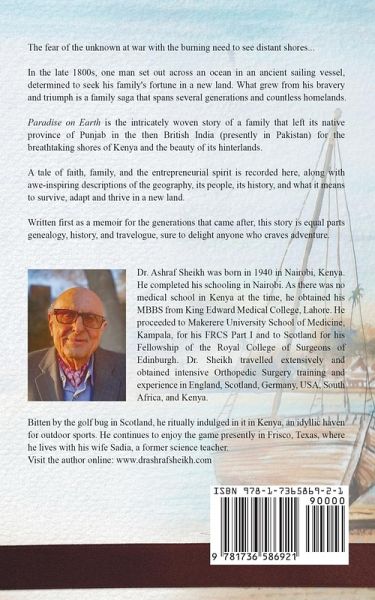The fear of the unknown at war with the burning need to see distant shores... In the late 1800s, one man set out across an ocean in an ancient sailing vessel, determined to seek his family's fortune in a new land. What grew from his bravery and triumph is a family saga that spans several generations and countless homelands. Paradise on Earth is the intricately woven story of a family that left its native province of Punjab in the then British India (presently in Pakistan) for the breathtaking shores of Kenya and the beauty of its hinterlands. A tale of faith, family, and the entrepreneurial spirit is recorded here, along with awe-inspiring descriptions of the geography, its people, its history, and what it means to survive, adapt and thrive in a new land. Written first as a memoir for the generations that came after, this story is equal parts genealogy, history, and travelogue, sure to delight anyone who craves adventure.