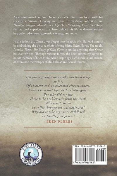 Award-nominated author Omar Gonzalez returns to form with his trademark mixture of poetry and prose. In his debut collection, The Phantom Struggle: Memoirs of a Life Once Struggling, Omar examined the personal experiences that have defined his life to date-love and heartache, adventure, domestic violence, and more. In this follow-up, Omar dives deeper into the topic of childhood trauma by embodying the persona of his lifelong friend Eden Flores. The result, Paradise Taken: The Diary of Eden Flores, is unlike anything that Omar has ever written. Through various forms, the book ultimately serves to honor the story of Eden Flores while inspiring all who seek to understand or overcome the vestiges of child abuse and sexual trauma.