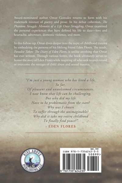 Award-nominated author Omar Gonzalez returns to form with his trademark mixture of poetry and prose. In his debut collection, The Phantom Struggle: Memoirs of a Life Once Struggling, Omar examined the personal experiences that have defined his life to date-love and heartache, adventure, domestic violence, and more. In this follow-up, Omar dives deeper into the topic of childhood trauma by embodying the persona of his lifelong friend Eden Flores. The result, Paradise Taken: The Diary of Eden Flores, is unlike anything that Omar has ever written. Through various forms, the book ultimately serves to honor the story of Eden Flores while inspiring all who seek to understand or overcome the vestiges of child abuse and sexual trauma.