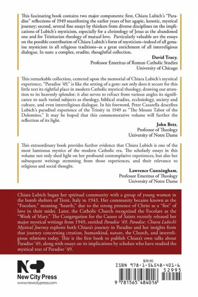 Paradise: Chiara Lubich's Mystical Journey is the first book to be published with Chiara's only two talks about Paradise '49, along with essays about that mystical journey and it implications for today's world. This book presents both Chiara's mystic journey in Paradise and her mystical journey in creation seeing humanity, nature and the Church in the light of Paradise. The latter journey gave Chiara mystical insights about the Church, humanity, and nature as well as God's will for all three in the future. The mystical genius of Chiara created a lay spirituality that seeks to realize Jesus's prayers: "Thy will be done on earth as it is in heaven" (Mt. 6:10), and "May they all be one" (Jn. 17:21). Essays by: Chiara Lubich, Peter Casarella, Thomas Norris, David L. Schindler, Piero Coda, Brendan Leahy, Donald W. Mitchell, Hubertus Blaumeiser, Luigino Bruni, Antonio Baggio, Bernard Callebaut, Gérard Rossé, Callan Slipper, Hubertus Blaumeiser, Roberto Catalano, Cinto Busquet, Brian K. Reynolds, Jesús Morán, Maria Voce, Cherylanne Menezes, Judith Povilus, Anna Pelli. This fascinating book contains two major components: first, Chiara Lubich's "Paradise" reflections of 1949 manifesting the earlier years of her agapic, kenotic, mystical journey; second, several fine essays by thinkers from diverse disciplines on the implications of Lubich's mysticism, especially for a christology of Jesus as the abandoned one and for Trinitarian theology of mutual love. Particularly valuable are the essays on the possible contribution of Chiara Lubich's form of mysticism--indeed of all genuine mysticism in all religious traditions--as a great enrichment of all inter-religious dialogue. In sum: a complex, erudite, thoughtful collection. -- David Tracy University of Chicago This remarkable collection centered upon the memorial of Chiara Lubich's mystical experience, "Paradise '49," is like the setting of a gem: not only does it secure for this little text its rightful place in modern Catholic mystical theology, drawing our attention to its heavenly splendor; it also serves to refract from various angles its significance to such varied subjects as theology, biblical studies, ecclesiology, society and culture, and even interreligious dialogue. In his foreword Peter Casarella describes Lubich's paradisal experience of the Trinity in 1949 as "The Mount Tabor of the Dolomites." It may be hoped that this commemorative volume will further the reflection of its light. -- John Betz Department of Theology University of Notre Dame The appearance of Paradise: Chiara Lubich¿s Mystical Journey is a wonderful contribution to the actual state of the field of mystic studies. In our times, where consistent spiritual experiences with strong features seem to be lacking, Chiara Lubich¿s experience testifies to the presence of those experiences in a new configuration. She is not the only one. Others too have had deep experiences of God in secular circumstances in contemporary times. What is fantastic about Chiara is the fact that she combines the deepest mystical revelations with the most current and practical tasks and details of everyday life. And she does that with a great comunitarian sense and a deep fidelity to the Church where she belongs. This collection of essays about her mystical journey will give the reader a good sense of the depth of Chiara's loving union with God in Christ and also her openness to everything that is created with their similarities and differences. -- Maria Clara Bingemer Professor of Theology Pontifical Catholic University of Rio de Janeiro These intelligent essays shed light on the profound contemplative experiences and subsequent writings about those experiences by Chiara Lubich. As such these reflections provide further evidence that she is one of the must luminous mystics of the modern Catholic era. -- Lawrence Cunningham The University of Notre Dame