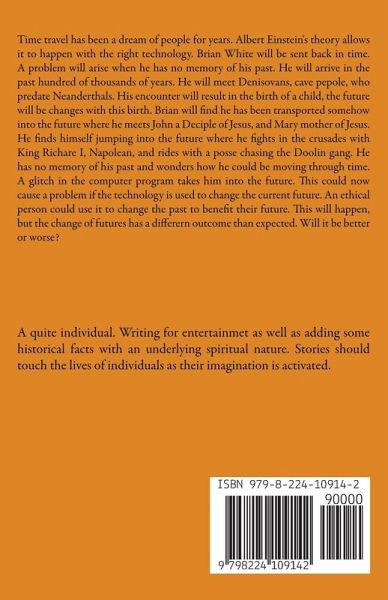 Time travel has been a dream of people for years. Albert Einstein's theory allows it to happen with the right technology. Brian White will be sent back in time. A problem will arise when he has no memory of his past. He will arrive in the past hundred of thousands of years. He will meet Denisovans, cave pepole, who predate Neanderthals. His encounter will result in the birth of a child, the future will be changes with this birth. Brian will find he has been transported somehow into the future where he meets John a Deciple of Jesus, and Mary mother of Jesus. He finds himself jumping into the future where he fights in the crusades with King Richare I, Napolean, and rides with a posse chasing the Doolin gang. He has no memory of his past and wonders how he could be moving through time. A glitch in the computer program takes him into the future. This could now cause a problem if the technology is used to change the current future. An ethical person could use it to change the past to benefit their future. This will happen, but the change of futures has a differern outcome than expected. Will it be better or worse?