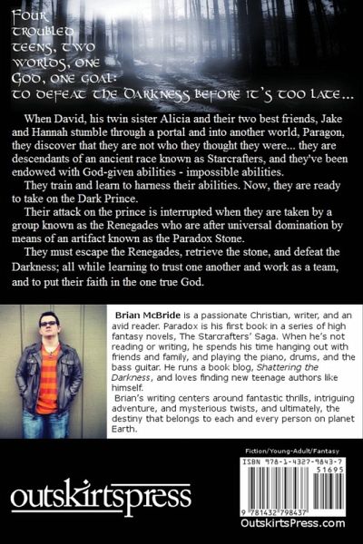 Four troubled teens, two worlds, one God, one goal: to defeat the Darkness before it's too late. When David, his twin sister Alicia and their two best friends, Jake and Hannah stumble through a portal and into another world, Paragon, they discover that they are not who they thought they were... they are descendants of an ancient race known as Starcrafters, and they've been endowed with God-given abilities - impossible abilities. They train and learn to harness their abilities. Now, they are ready to take on the Dark Prince. Their attack on the prince is interrupted when they are taken by a group known as the Renegades who are after universal domination by means of an artifact known as the Paradox Stone. They must escape the Renegades, retrieve the stone, and defeat the Darkness; all while learning to trust one another and work as a team, and to put their faith in the one true God.
