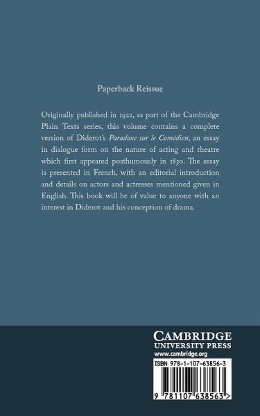 Originally published in 1922 as part of the Cambridge Plain Texts series, this volume contains a complete version of Diderot's Paradoxe sur le comédien, an essay in dialogue form on the nature of acting and theatre which first appeared posthumously in 1830. The essay is presented in French, with an editorial introduction and details on actors and actresses mentioned given in English. This book will be of value to anyone with an interest in Diderot and his conception of drama.