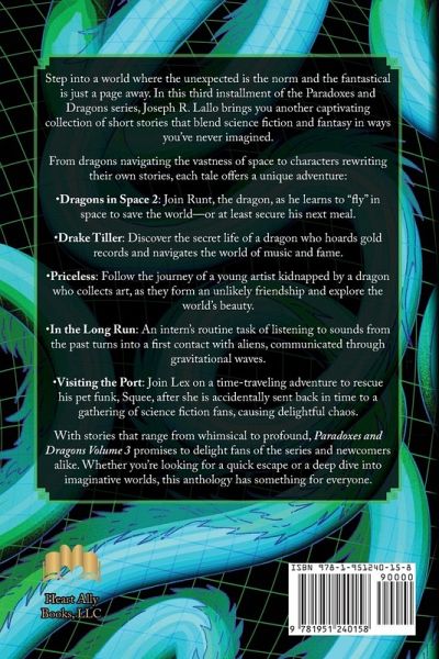 Step into a world where the unexpected is the norm and the fantastical is just a page away. In this third installment of the Paradoxes and Dragons series, Joseph R. Lallo brings you another captivating collection of short stories that blend science fiction and fantasy in ways you've never imagined. From dragons navigating the vastness of space to characters rewriting their own stories, each tale offers a unique adventure:Dragons in Space 2: Join Runt, the dragon, as he learns to "fly" in space to save the world-or at least secure his next meal. Drake Tiller: Discover the secret life of a dragon who hoards gold records and navigates the world of music and fame. Priceless: Follow the journey of a young artist kidnapped by a dragon who collects art, as they form an unlikely friendship and explore the world's beauty. In the Long Run: An intern's routine task of listening to sounds from the past turns into a first contact with aliens, communicated through gravitational waves. Visiting the Port: Join Lex on a time-traveling adventure to rescue his pet funk, Squee, after she is accidentally sent back in time to a gathering of science fiction fans, causing delightful chaos. With stories that range from whimsical to profound, Paradoxes and Dragons Volume 3 promises to delight fans of the series and newcomers alike. Whether you're looking for a quick escape or a deep dive into imaginative worlds, this anthology has something for everyone.