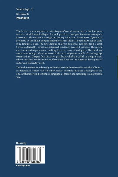 "Piotr Lukowski's Paradoxes is an abridged, revised and translated version of a book written in Polish ... . As a source of paradoxes and arguments related to them, the book is highly valuable. ... Lukowski often develops his analyses carefully. In his book he not only gathers the paradoxes ... but also presents a rather unified and interesting view on them. It is definitely a good read." (Rafal Urbaniak, Studia Logica, Vol. 101, 2013)