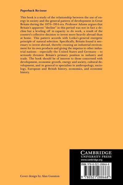 This book is a study of the relationship between the use of energy in society and the general pattern of development in Great Britain during the 1870-1914 era. Professor Adams argues that Britain's apparent 'decline' in this period was not in fact a decline but a levelling off in capacity to do work, a result of the country's collective decision to invest more heavily abroad than at home. This pattern accords with Lotka's general energetic principle of natural selection. Specifically, Britain found it necessary to invest abroad, thereby creating an industrial environment for its own products and giving the impetus to other industrial nations - especially the United States and Germany - to seriously threaten Britain's primary position in industry and trade. The book should be of interest to those concerned with development, economic growth, energy and society, cultural development, and in general to specialists in anthropology, sociology, European and British history, economics and economic history.