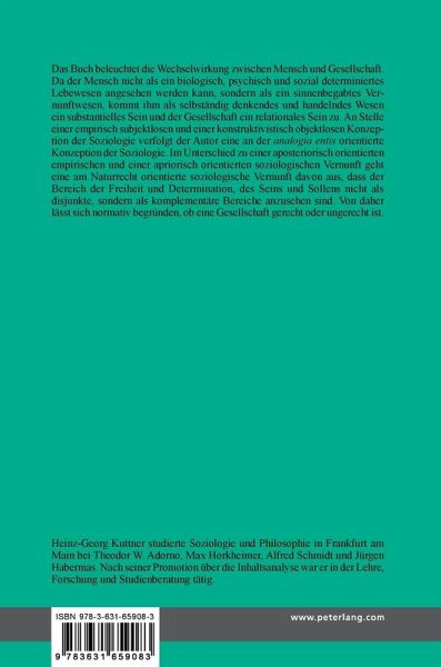Das Buch beleuchtet die Wechselwirkung zwischen Mensch und Gesellschaft. Da der Mensch nicht als ein biologisch, psychisch und sozial determiniertes Lebewesen angesehen werden kann, sondern als ein sinnenbegabtes Vernunftwesen, kommt ihm als selbständig denkendes und handelndes Wesen ein substantielles Sein und der Gesellschaft ein relationales Sein zu. An Stelle einer empirisch subjektlosen und einer konstruktivistisch objektlosen Konzeption der Soziologie verfolgt der Autor eine an der analogia entis orientierte Konzeption der Soziologie. Im Unterschied zu einer aposteriorisch orientierten empirischen und einer apriorisch orientierten soziologischen Vernunft geht eine am Naturrecht orientierte soziologische Vernunft davon aus, dass der Bereich der Freiheit und Determination, des Seins und Sollens nicht als disjunkte, sondern als komplementäre Bereiche anzusehen sind. Von daher lässt sich normativ begründen, ob eine Gesellschaft gerecht oder ungerecht ist.