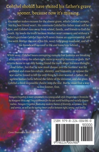 Cohthel should have visited Father's grave sooner. Because now it's missing. His mother makes excuses for the absent grave, which Cohthel accepts, but his best friend won't. He convinces Cohthel his father must still be alive, and Cohthel runs away from school, family, and friends to find the truth. He needs the truth because Mother won't remarry and without a father's guidance Cohthel fears he'll never choose an apprenticeship, will live with Mother the rest of his life, won't fully grasp manhood, and all his friends will succeed in life and leave him behind. ¿While away, Cohthel hears corrupting rumors that humans are breaking alliances to force the other eight races to worship humans as gods. He returns home to not only having found the truth about his once-thought-dead father, but that he now must choose: join the humans' war for godhood and erase his culture, identity, and humanity, or oppose the war and be forced to kill the only thing he's ever wanted: a father. An ageless human lurks behind the fabric of the universe, and she gives Cohthel a third impossible choice: stop the war. But he must find a way to live forever, first. AUTHOR'S NOTE: The ebook version of this novel does not include the fantasy map, the dedication page, or follow-on excerpt for The Lost Gods Book 2 at the end. All print versions of this book found elsewhere include those items.