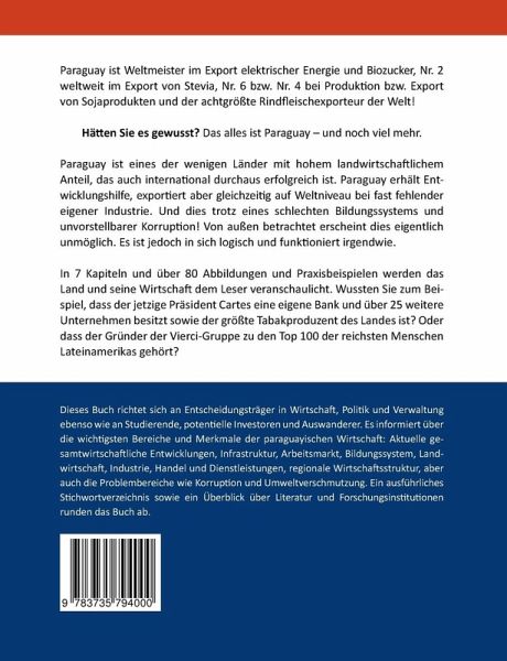 Nr. 1 im weltweiten Export elektrischer Energie und BiozuckerNr. 2 im Export von SteviaNr. 4 bzw. 6 beim Export und Produktion von SojaproduktenNr. 5 beim Chia-Export, Nr. 6 bei Mais, Nr. 10 bei Weizen- und Nr. 15 bei ReisexportNr. 8 beim weltweiten RindfleischexportHätten Sie es gewusst? - Das alles ist Paraguay - und noch viel mehr.Paraguay ist eines der wenigen Länder mit hohem landwirtschaftlichem Anteil, das auch international durchaus erfolgreich ist. Das Land erhält Entwicklungshilfe, exportiert aber gleichzeitig auf Weltniveau bei fast fehlender eigener Industrie.Und dies trotz eines schlechten Bildungssystems und unvorstellbarer Korruption! Von außen betrachtet erscheint dies eigentlich unmöglich. Es ist jedoch in sich logisch und funktioniert irgendwie. Viele betriebswirtschaftliche Konzepte funktionieren anders als in Lehrbüchern beschrieben. Anhand statistischer Daten und Praxisbeispielen werden das Land und seine Wirtschaft dem Leser veranschaulicht. Zahlreiche Beispiele zeigen u.a., welche Unternehmen und Konzerne es in Paraguay gibt und welch großen Einfluss diese auf die paraguayische Wirtschaft haben. Wussten Sie zum Beispiel, dass der jetzige Präsident Cartes eine Bank und über 25 weitere Unternehmen besitzt und der größte Tabakproduzent des Landes ist? Oder dass der Gründer der Vierci-Gruppe zu den Top 100 der reichsten Menschen Lateinamerikas gehört?Dieses Buch richtet sich an Entscheidungsträger in Wirtschaft, Politik und Verwaltung ebenso wie an Studierende, potentielle Investoren und Auswanderer. 7 Kapitel, über 80 Abbildungen, Tabellen und konkrete Praxisbeispiele informieren übersichtlich auf 240 Seiten über die wichtigsten Bereiche und Merkmale der paraguayischen Wirtschaft: Aktuelle Gesamtwirtschaftliche Entwicklungen, Infrastruktur, Arbeitsmarkt, Bildungssystem, Landwirtschaft, Industrie, Handel und Dienstleistungen, regionale Wirtschaftsstruktur, aber auch die Problembereiche wie Korruption und Umweltverschmutzung. Ein ausführliches Stichwortverzeichnis sowie ein Überblick über Literatur und Forschungsinstitutionen runden das Buch ab.