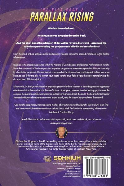 War has been declared. The Tantum Terrae are poised to strike back. And the alien signal from Kepler-1649c will be revealed to world-assuming the scientists spearheading the project aren't killed in the crossfire first. From the mind of best-selling novelist Christopher Hopper comes the second installment in the thrilling Infinita series. Restored to his prestigious position within the Nations of United Space and Science Administration, Jericho Fox takes command of the Marquis-class ship's test program-a mission that promises to move humanity to a habitable exoplanet. His new team is composed of the division's best and brightest, but not everyone believes he's fit for the job. As launch hour nears, Jericho must fight to keep his crew from following the doomed fate of his last mission. Meanwhile, Dr. Evelyn Park leads her expanding team of brilliant scientists in decoding the now legendary alien transmission that survived the Astraea Station catastrophe. However, the deeper they get, the more the complex the signal's architecture becomes. Before her team can break the code, the Search for Extrasolar Sentient Intelligence headquarters comes under attack, and the lives of her people are threatened. Can Jericho keep history from repeating itself as all eyes turn toward his launch? Will Evelyn's team find the key to unlock the alien transmission before it's too late? Find out in the next exciting Infinita series installment, Parallax Rising. Buy it today! Available in trade and mass market paperback, hardcover, audiobook, and ebook at christopherhopper.com.