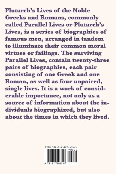 Plutarch's Lives of the Noble Greeks and Romans, commonly called Parallel Lives or Plutarch's Lives, is a series of biographies of famous men, arranged in tandem to illuminate their common moral virtues or failings. The surviving Parallel Lives, contain twenty-three pairs of biographies, each pair consisting of one Greek and one Roman, as well as four unpaired, single lives. It is a work of considerable importance, not only as a source of information about the individuals biographized, but also about the times in which they lived.