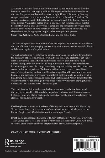 Through entertaining yet informative short comparisons, this volume demonstrates the humanity of heroes and villains from different times and places through their often idiosyncratic similarities and differences. Readers gain not only a fuller understanding of the late Roman and early American Republics and their leaders but also an appreciation for comparative biography in its ability to make connections across the human experience. The book provides a way to connect two different areas of study, focusing on how republicanism shaped both Romans and American Founders and providing a previously unexplored contribution to a growing trend of broadening historical exposure. In doing so, Baughman and Poston demonstrate the continued need for connecting differentfields of history while also helping students understand their connection to the ancient past.
