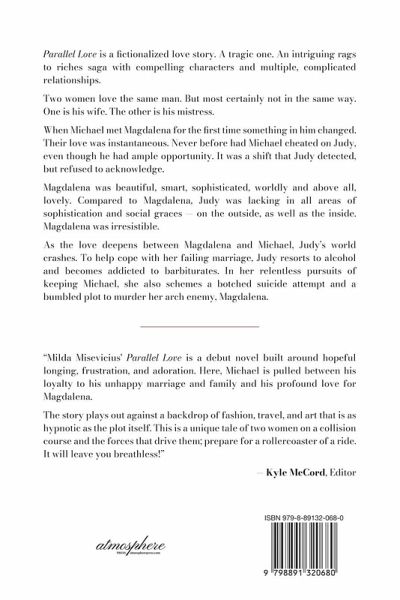 Parallel Love is a fictionalized love story. A tragic one. An intriguing rags to riches saga with compelling characters and multiple, complicated relationships. Two woman love the same man. But most certainly not in the same way. One is his wife. The other is his mistress. When Michael meets Magdalena for the first time something in him changed. Their love was instantaneous. Never before had Michael cheated on Judy, even though he had ample opportunity. It was a shift that Judy defected, but refused to acknowledge. Magdalena was beautiful, smart, sophisticated, worldly and above all, lovely. Compared to Magdalena, Judy was lacking in all areas of sophistication and social graces - on the outside, as well as, the inside. Magdalena was irresistible. As the love deepens between Magdalena and Michael, Judy's world crashes. To help cope with her failing marriage, Judy resorts to alcohol and becomes addicted to barbiturates. In her relentless pursuits of keeping Michael, she also schemes a blotched suicide attempt and a bumbled plot to murder her arch enemy, Magdalena. - "Milda Misevicius' Parallel Love is a debut novel built around hopeful longing, frustration, and adoration. Here, Michael is pulled between his loyalty to his unhappy marriage and family and his profound love for Magdalena. The story plays out against a backdrop of fashion, travel, and art that is as hypnotic as the plot itself. This is a unique tale of two women on a collision course and the forces that drive them; prepare for a rollercoaster of a ride. It will leave you breathless!" - Kyle McCord, Editor