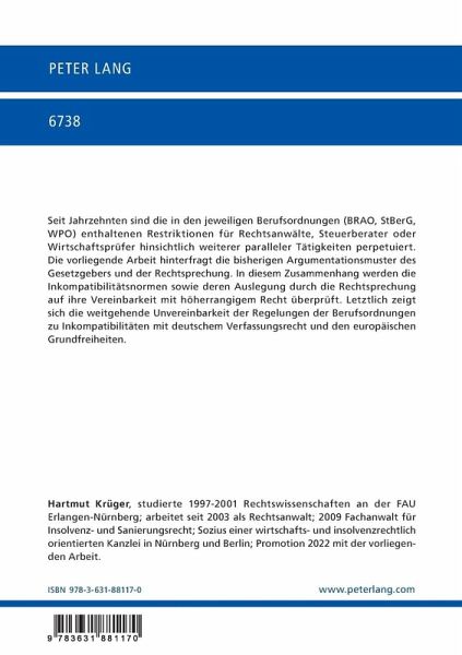 Seit Jahrzehnten sind die in den jeweiligen Berufsordnungen (BRAO, StBerG, WPO) enthaltenen Restriktionen für Rechtsanwälte, Steuerberater oder Wirtschaftsprüfer hinsichtlich weiterer paralleler Tätigkeiten perpetuiert. Die vorliegende Arbeit hinterfragt die bisherigen Argumentationsmuster des Gesetzgebers und der Rechtsprechung. In diesem Zusammenhang werden die Inkompatibilitätsnormen sowie deren Auslegung durch die Rechtsprechung auf ihre Vereinbarkeit mit höherrangigem Recht überprüft. Letztlich zeigt sich die weitgehende Unvereinbarkeit der Regelungen der Berufsordnungen zu Inkompatibilitäten mit deutschem Verfassungsrecht und den europäischen Grundfreiheiten.