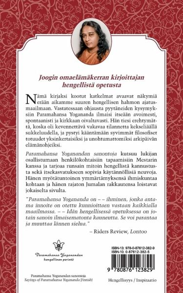 Ihmettelemme ehkä useinkin: "Vaikuttavatko rukoukseni?Kuuleeko Jumala minua?" Tämä innoittava kirja kertoo, miten voimme syventää rukoustemme voimaa ja luoda niistä päivittäisen rakkauden, lujuuden ja ohjauksen lähteen. Teos tarjoaa viisautta ja oivalluksia, jotka on valittu Paramahansa Yoganandan kirjoituksista; se on kauniisti laadittu antaumuksellinen opas, joka inspiroi kaikkiin uskontoihin kuuluvia. Kokoelma lausumia, anekdootteja ja viisauden sanoja - Paramahansa Yoganandan vilpittömiä ja rakastavia vastauksia niille, jotka tulivat hakemaan häneltä opastusta. Nämä lyhyet katkelmat kutsuvat lukijaa osallistumaan henkilökohtaisiin keskusteluihin ja kokemuksiin Paramahansa Yoganandan seurassa. Hänen myötätuntoinen ymmärtämyksensä ihmiskuntaa kohtaan ja hänen syvä Jumalan rakkautensa loistavat jokaiselta sivulta