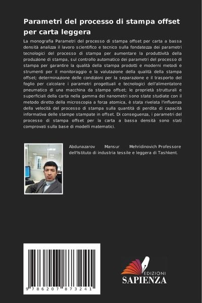 La monografia Parametri del processo di stampa offset per carta a bassa densità analizza il lavoro scientifico e tecnico sulla fondatezza dei parametri tecnologici del processo di stampa per aumentare la produttività della produzione di stampa, sul controllo automatico dei parametri del processo di stampa per garantire la qualità della stampa prodotti e moderni metodi e strumenti per il monitoraggio e la valutazione della qualità della stampa offset; determinazione delle condizioni per la separazione e il trasporto del foglio per calcolare i parametri progettuali e tecnologici dell'alimentatore pneumatico di una macchina da stampa offset; le proprietà strutturali e superficiali della carta nella gamma dei nanometri sono state studiate con il metodo diretto della microscopia a forza atomica, è stata rivelata l'influenza della velocità del processo di stampa sulla quantità di perdita di capacità informativa delle stampe stampate in offset. Di conseguenza, i parametri del processo di stampa offset per la carta a bassa densità sono stati comprovati sulla base di modelli matematici.