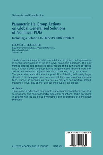 E.E. Rosinger Parametric Lie Group Actions on Global Generalised Solutions of Nonlinear PDEs Including a Solution to Hilbert's Fifth Problem "This book presents a novel approach to Lie group actions on ordinary and generalized functions, based on parametric representation. This allows a global definition of arbitrary nonlinear Lie group actions on functions, including generalized functions. The parametric approach also makes possible a global definition for Lie semigroup actions. It is shown that the usual Lie group symmetries of classical solutions of smooth nonlinear PDEs will remain Lie group symmetries of generalized solutions of such equations." -MATHEMATICAL REVIEWS