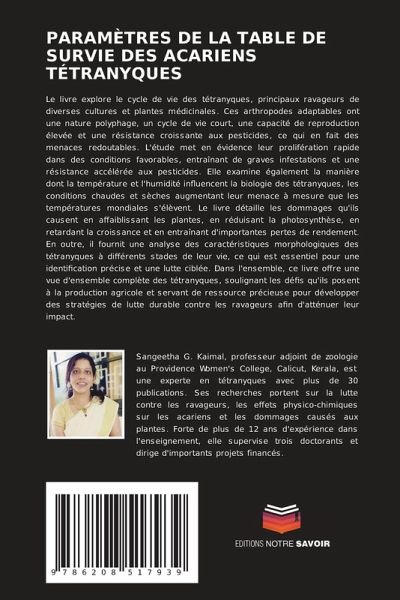 Le livre explore le cycle de vie des tétranyques, principaux ravageurs de diverses cultures et plantes médicinales. Ces arthropodes adaptables ont une nature polyphage, un cycle de vie court, une capacité de reproduction élevée et une résistance croissante aux pesticides, ce qui en fait des menaces redoutables. L'étude met en évidence leur prolifération rapide dans des conditions favorables, entraînant de graves infestations et une résistance accélérée aux pesticides. Elle examine également la manière dont la température et l'humidité influencent la biologie des tétranyques, les conditions chaudes et sèches augmentant leur menace à mesure que les températures mondiales s'élèvent. Le livre détaille les dommages qu'ils causent en affaiblissant les plantes, en réduisant la photosynthèse, en retardant la croissance et en entraînant d'importantes pertes de rendement. En outre, il fournit une analyse des caractéristiques morphologiques des tétranyques à différents stades de leur vie, ce qui est essentiel pour une identification précise et une lutte ciblée. Dans l'ensemble, ce livre offre une vue d'ensemble complète des tétranyques, soulignant les défis qu'ils posent à la production agricole et servant de ressource précieuse pour développer des stratégies de lutte durable contre les ravageurs afin d'atténuer leur impact.