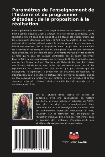L'enseignement de l'histoire a fait l'objet de diverses recherches et a été le thème central d'études visant à analyser et à re-signifier sa pratique. Cette recherche s'inscrit dans ce contexte et vise à étudier les appropriations que les enseignants d'histoire ont faites et font des Paramètres du curriculum national, ainsi que leur utilisation dans le développement des connaissances historiques scolaires. Tout au long de la démarche, j'ai cherché à identifier les arnaques et les tactiques que les enseignants utilisent pour développer leurs pratiques, qui se réalisent dans un contexte marqué par des rapports de force qui ne sont pas toujours identifiables par les sujets concernés. Pour ce faire, je me suis appuyée sur le champ de l'histoire culturelle, ainsi que sur les études de Roger Chartier et de Michel de Certeau. En croisant des études théoriques et des recherches de terrain dans des écoles représentant les contextes les plus variés, j'ai pu conclure que les enseignants re-signifiaient la proposition du document en question, ne s'appropriant, pour la mettre en pratique dans leur travail quotidien, que ce qui leur convenait en fonction de leur contexte, de leur formation et de leur structure de travail, renforçant ainsi leurs attributions de sens dans la vie quotidienne de l'école.