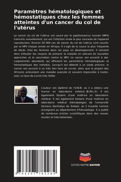Le cancer du col de l'utérus est causé par le papillomavirus humain (HPV) transmis sexuellement, qui est l'infection virale la plus courante de l'appareil reproducteur. Environ 50 000 cas de cancer du col de l'utérus sont causés par le HPV chaque année en Afrique. Il s'agit de la cause la plus fréquente de décès chez les femmes dans les pays en développement. Il convient donc d'étudier les moyens de prévenir la maladie en utilisant de nouvelles approches et la vaccination contre le HPV. Le cancer est associé à des saignements abondants qui affectent les paramètres hématologiques et hémostatiques des individus. Lorsqu'il est détecté à un stade précoce, le cancer est associé à un très bon taux de survie, alors que la plupart des Africains présentent une maladie avancée et souvent impossible à traiter, avec un taux de survie très faible.