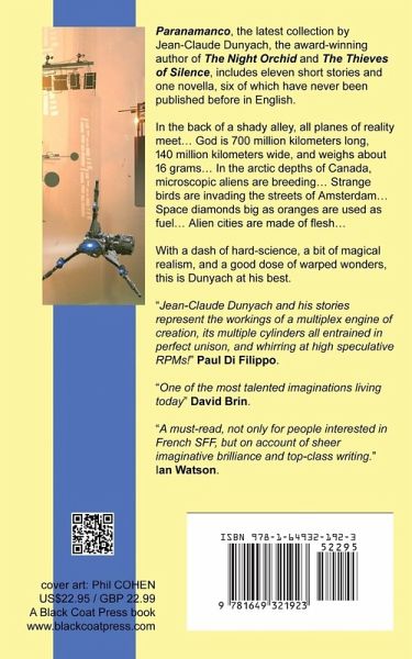 Paranamanco, the latest collection by Jean-Claude Dunyach, the award-winning author of The Night Orchid and The Thieves of Silence, includes eleven short stories and one novella, six of which have never been published before in English. In the back of a shady alley, all planes of reality meet... God is 700 million kilometers long, 140 million kilometers wide, and weighs about 16 grams... In the arctic depths of Canada, microscopic aliens are breeding... Strange birds are invading the streets of Amsterdam... Space diamonds big as oranges are used as fuel... Alien cities are made of flesh... With a dash of hard-science, a bit of magical realism, and a good dose of warped wonders, this is Dunyach at his best. "Jean-Claude Dunyach and his stories represent the workings of a multiplex engine of creation, its multiple cylinders all entrained in perfect unison, and whirring at high speculative RPMs!" Paul Di Filippo. Find out why The Night Orchid was called "one of the most successful single-author collections I've read for some time" (Alien OnLine) and "a definite must-read for science fiction fans" (Blether) and Dunyach "one of the most talented imaginations living today" (David Brin). "A must-read, not only for people interested in French SFF, but on account of sheer imaginative brilliance and top-class writing... After this banquet, from now on I shall immediately read any new story by Dunyach that I see; and so should you." Ian Watson.