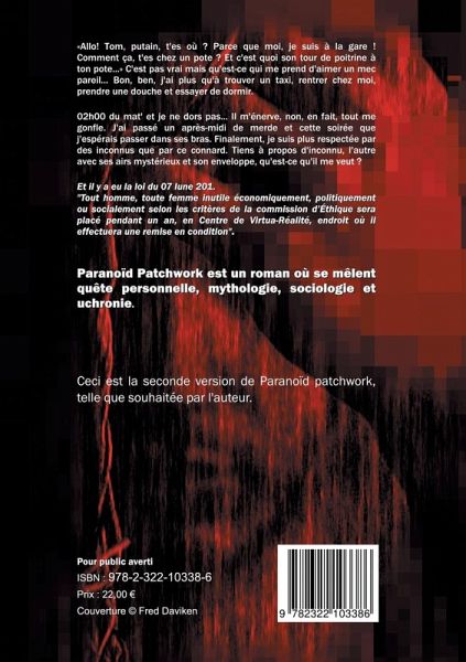 Roman à plusieurs voix, Paranoïd Patchwork vous révèle progressivement Céline, trente et quelques années, à un moment clé de sa vie. Au gré de ses souvenirs, de ses peurs, de ses rencontres, de ses doutes et de ses choix, retrouvera-t-elle l'auteur de cette lettre remise dans un train ? Saura-t-elle qui est Gabriel, ce vieil homme au regard doux et protecteur ? Empêchera-t-elle la destruction prochaine de tous les êtres humains ? Et à quel prix ? Au-delà d'un cheminement individuel sous forme d'enquête, pour comprendre un testament en morceaux, ce sont dix mille ans d'humanité qui se répètent un peu plus vite, un peu plus fort, un peu plus absurdement. Comme un train lancé vers un mur. Un train qui est le nôtre. Un mur que nous bâtissons. Paranoid Patchwork est un roman où se mêlent mythologie, sociologie et uchronie.Cette version respecte le découpage voulu par l'auteur.