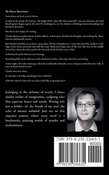 The Silence That Listens Some places are loud, even in silence. A cabin in the woods, for instance. You might think a place like that is peaceful-just you, the trees, the wind knocking lazy fingers against the roof. No honking cars, no city chatter, no flashing screens demanding your attention. Just quiet. But silence isn't empty. It's waiting. Charlie Morries needed a break. A little stillness. A little space. Just him, his thoughts, and nothing else. That's what he told himself, anyway. But Charlie's mind has never been a quiet place. He has schizophrenia-voices that aren't his, shadows at the edges of his vision, memories that shift like sand. Medication helps, most of the time. But here, in the middle of nowhere, where the only sound is the one in his head, the lines start to blur. A floorboard creaks when no one's moving. Something shifts in the reflection of the darkened window-but only when he's not looking. And at night, when the wind stops, when the world holds its breath, a voice whispers to him from the walls. A voice he hasn't heard in years. Charlie came here alone. So why does it feel like something is here with him? And why, when he closes his eyes, does it feel like it's getting closer?