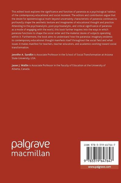 This edited book explores the under-analyzed significance and function of paranoia as a psychological habitus of the contemporary educational and social moment. The editors and contributors argue that the desire for epistemological truth beyond uncertainty characteristic of paranoia continues to profoundly shape the aesthetic texture and imaginaries of educational thought and practice. Attending to the psychoanalytic, post-psychoanalytic, and critical significance of paranoia as a mode of engaging with the world, this book further inquires into the ways in which paranoia functions to shape the social order and the material desire of subjects operating within it. Furthermore, the book aims to understand how the paranoiac imaginary endemic to contemporary educational thought manifests itself throughout the social field and what issues it makes manifest for teachers, teacher educators, and academics working toward social transformation.