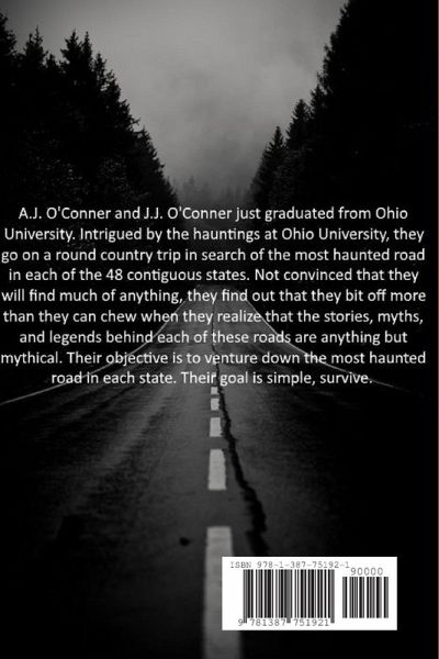 A.J. O'Conner and J.J. O'Conner just graduated from Ohio University. Intrigued by the hauntings at Ohio University, they go on a round country trip in search of the most haunted road in each of the 48 contiguous states. Not convinced that they will find much of anything, they find out that they bit off more than they can chew when they realize that the stories, myths, and legends behind each of these roads are anything but mythical. Their objective is to venture down the most haunted road in each state. Their goal is simple, survive.