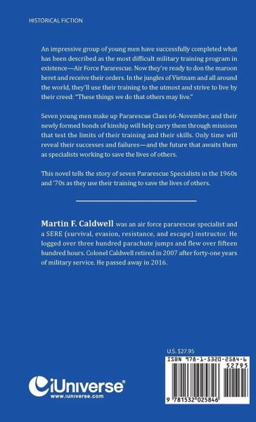 An impressive group of young men have successfully completed what has been described as the most difficult military training program in existence-Air Force Pararescue. Now they're ready to don the maroon beret and receive their orders. In the jungles of Vietnam and all around the world, they'll use their training to the utmost and strive to live by their creed: "These things we do that others may live." Seven young men make up Pararescue Class 66-November, and their newly formed bonds of kinship will help carry them through missions that test the limits of their training and their skills. Only time will reveal their successes and failures-and the future that awaits them as specialists working to save the lives of others. This novel tells the story of seven Pararescue Specialists in the 1960s and '70s as they use their training to save the lives of others.