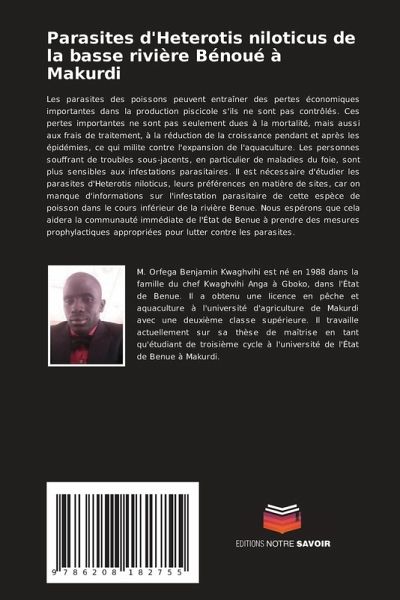 Les parasites des poissons peuvent entraîner des pertes économiques importantes dans la production piscicole s'ils ne sont pas contrôlés. Ces pertes importantes ne sont pas seulement dues à la mortalité, mais aussi aux frais de traitement, à la réduction de la croissance pendant et après les épidémies, ce qui milite contre l'expansion de l'aquaculture. Les personnes souffrant de troubles sous-jacents, en particulier de maladies du foie, sont plus sensibles aux infestations parasitaires. Il est nécessaire d'étudier les parasites d'Heterotis niloticus, leurs préférences en matière de sites, car on manque d'informations sur l'infestation parasitaire de cette espèce de poisson dans le cours inférieur de la rivière Benue. Nous espérons que cela aidera la communauté immédiate de l'État de Benue à prendre des mesures prophylactiques appropriées pour lutter contre les parasites.