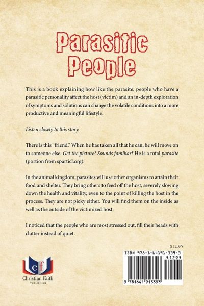This is a book explaining how like the parasite, people who have a parasitic personality affect the host (victim) and an in-depth exploration of symptoms and solutions can change the volatile conditions into a more productive and meaningful lifestyle. Listen closely to this story. There is this "friend." When he has taken all that he can, he will move on to someone else. Get the picture? Sounds familiar? He is a total parasite (portion from sparticl.org). In the animal kingdom, parasites will use other organisms to attain their food and shelter. They bring others to feed off the host, severely slowing down the health and vitality, even to the point of killing the host in the process. They are not picky either. You will find them on the inside as well as the outside of the victimized host. I noticed that the people who are most stressed out, fill their heads with clutter instead of quiet.