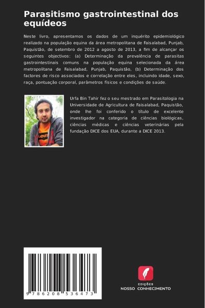 Neste livro, apresentamos os dados de um inquérito epidemiológico realizado na população equina da área metropolitana de Faisalabad, Punjab, Paquistão, de setembro de 2012 a agosto de 2013, a fim de alcançar os seguintes objectivos: (a) Determinação da prevalência de parasitas gastrointestinais comuns na população equina selecionada da área metropolitana de Faisalabad, Punjab, Paquistão, (b) Determinação dos factores de risco associados e correlação entre eles, incluindo idade, sexo, raça, pontuação corporal, parâmetros físicos e condições de saúde.