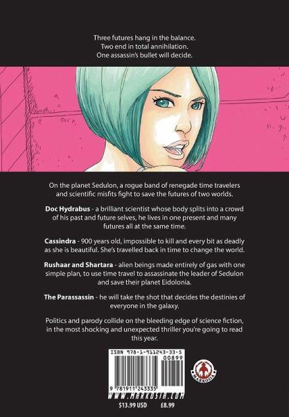 Three futures hang in the balance. Two end in total annihilation. One assassin’s bullet will decide. On the planet Sedulon, a rogue band of renegade time travelers and scientific misfits fight to save the futures of two worlds. Doc Hydrabus - a brilliant scientist whose body splits into a crowd of his past and selves, he lives in one present and many futures all at the same time Cassindra - 900 years old, impossible to kill and every bit as deadly as she is beautiful. She’s travelled back in time to change the world. Rushaar and Shartara - alien beings made entirely of gas with one simple plan, to use time travel to assassinate the leader of Sedulon and save their planet Eidolonia. The Parassassin - he will take the shot that decides the destinies of everyone in the galaxy. Politics and parody collide on the bleeding edge of science fiction, in the most shocking and unexpected thriller you’re going to read this year.