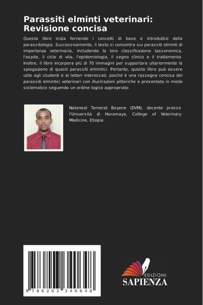 Questo libro inizia fornendo i concetti di base e introduttivi della parassitologia. Successivamente, il testo si concentra sui parassiti elminti di importanza veterinaria, includendo la loro classificazione tassonomica, l'ospite, il ciclo di vita, l'epidemiologia, il segno clinico e il trattamento. Inoltre, il libro incorpora più di 70 immagini per supportare ulteriormente la spiegazione di questi parassiti elmintici. Pertanto, questo libro può essere utile agli studenti e ai lettori interessati, poiché è una rassegna concisa dei parassiti elmintici veterinari con illustrazioni pittoriche e presentata in modo sistematico seguendo un ordine logico appropriato.