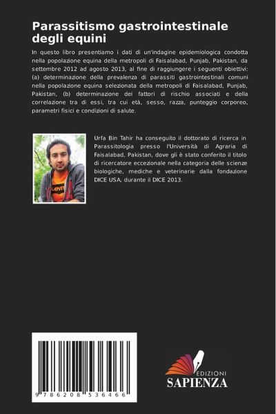 In questo libro presentiamo i dati di un'indagine epidemiologica condotta nella popolazione equina della metropoli di Faisalabad, Punjab, Pakistan, da settembre 2012 ad agosto 2013, al fine di raggiungere i seguenti obiettivi: (a) determinazione della prevalenza di parassiti gastrointestinali comuni nella popolazione equina selezionata della metropoli di Faisalabad, Punjab, Pakistan, (b) determinazione dei fattori di rischio associati e della correlazione tra di essi, tra cui età, sesso, razza, punteggio corporeo, parametri fisici e condizioni di salute.