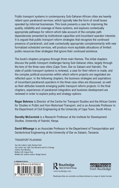 Public transport systems in contemporary Sub-Saharan African cities are heavily reliant upon paratransit services. These services are defined as informal transportation which operates between the public and individual private spheres. In Africa paratransit is characterized by low quality of vehicles and chaotic management but it also provides cheap, accessible and flexible transport solutions for the urban poor. It is typically poorly regulated and operates as a set of informal businesses. A common result of weak public sector regulation and a fare strategy in which owners claim a fixed daily revenue target and drivers who keep the variable balance as income, is destructive competition and poor quality of service. There is an incontrovertible case for improving the quality, reliability and coverage of public transport systems, and some city governments have attempted to do so by initiating reform projects that envisage the phased replacement of paratransit operations with formalised bus rapid transit systems. In this book the authors argue that there are, however, path dependencies and constraints that limit the possible extent of public transport system reform. Paratransit operations also have some inherent advantages with respect to demand responsiveness and service innovation. Attempts to eradicate paratransit may be neither pragmatic nor strategic. Two future scenarios are likely: hybrid systems comprised of both paratransit and formally planned modes; and systems improved by upgrades and strengthened regulation of existing paratransit services. The business strategies and aspirations of incumbent paratransit operators in three case cities - Cape Town, Dar es Salaam and Nairobi - are discussed, as well as their attitudes towards emerging public transport reform projects. International experiences of hybrid system regulation and paratransit business development are reviewed in order to explore policy options. The authors contend that policies recognising paratransit operators, and seeking contextually appropriate complementarity with formalised planned services, will produce greater benefits than policies ignoring their continued existence.