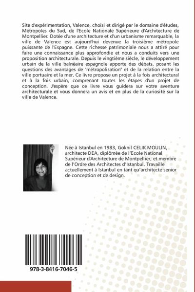 Site d'expérimentation, Valence, choisi et dirigé par le domaine d'études, Métropoles du Sud, de l'Ecole Nationale Supérieure d'Architecture de Montpellier. Dotée d'une architecture et d'un urbanisme remarquable, la ville de Valence est aujourd'hui devenue la troisième métropole puissante de l'Espagne. Cette richesse patrimoniale nous a attiré pour faire une connaissance plus approfondie et nous a conduits vers une proposition architecturale. Depuis le vingtième siècle, le développement urbain de la ville balnéaire espagnole apporte des débats, posant les questions des avantages de "métropolisation" et de la relation entre la ville portuaire et la mer. Ce livre propose un projet à la fois architectural et à la fois urbain, comprenant toutes les étapes d'un projet de conception. J'espère que ce livre vous guidera sur votre aventure architecturale et vous donnera un avis et en plus de la curiosité sur la ville de Valence.